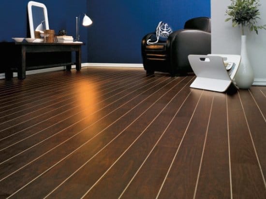 Темный ламинат со светлой фаской задаст помещению определенный ритм. Такое покрытие зрительно удлинит помещение.