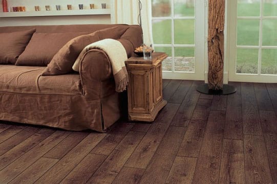 Ламинат темных оттенков, имитирующий структуру дощатого пола можно использовать в интерьере данного стиля, как альтернативу натуральному дереву.
