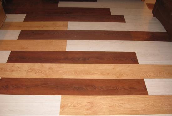 Укладывая поочередно доски ламината нескольких цветов, создаем необычное цветовое решение пола. Такой вариант подойдет креативным, боящимся монотонности людям.