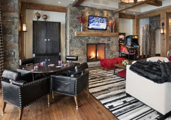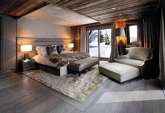 Швейцарское шале – в переводе «хижина пастухов» или «сельский дом» — это сочетание натурального дерева и камня, наличие открытых потолочных балок натуральных оттенков, как правило, темных, которые сочетаются с оттенком пола. Ламинат цвета «орех» или «ясень» отлично подойдет для интерьера в этом стиле.