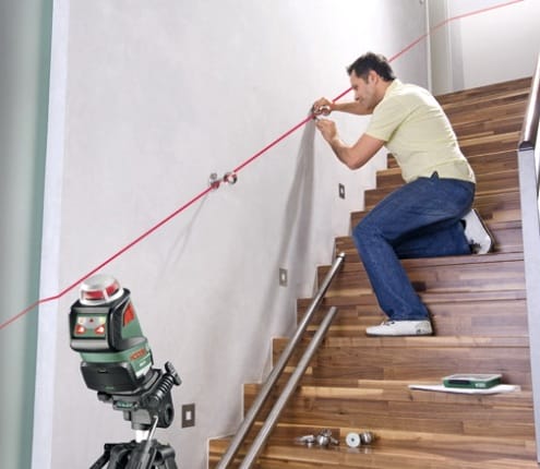 Таким прибором можно работать и на наклонных поверхностях. Для примера возьмем лестничный марш. Закрепив на нем лазерный построитель плоскостей, мы сможем точно и ровно выполнить отделку стены параллельно лестнице.