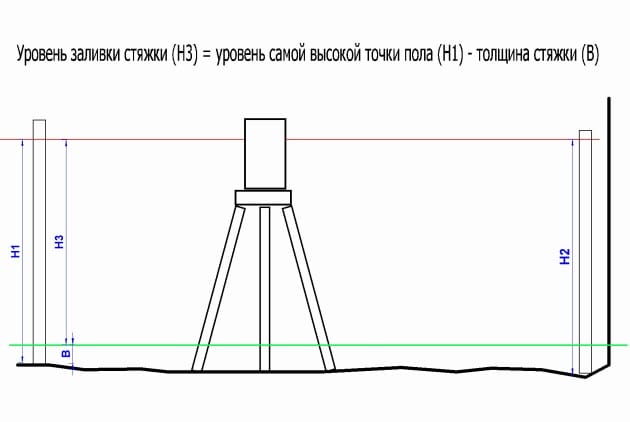 Самый маленький отсчет на линейке даст нам отметку самой высокой точки. Отминусовав от нее толщину стяжки, переносим полученное расстояние от линии луча вниз по стене и получаем уровень, до которого нужно заливать стяжку.
