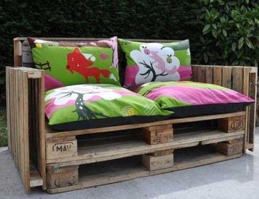 Можно сделать простую скамейку самому, используя деревянные поддоны. Два из них пойдут на основание, а третий станет спинкой. Его верхнюю часть нужно прикрепить к сиденью двумя длинными досками-затяжками, а нижнее ребро зафиксировать саморезами.