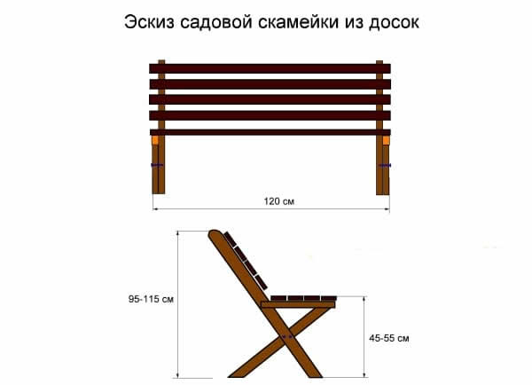 С первой попытки вы сможете качественно сделать скамейку со спинкой своими руками, если выберете самую простую конструкцию и сделаете ее чертеж. Мы предлагаем остановиться на варианте из досок. Боковины из них служат опорами для сиденья и основой для крепления спинки.