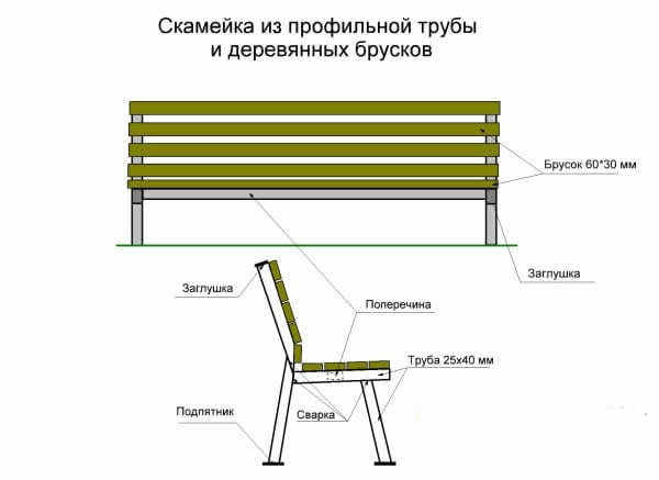 Для жесткого соединения боковин будет достаточно одной поперечной трубы, вваренной в опорную трубу сиденья. Деревянная обшивка дополнительно усилит конструкцию. Для ее крепления можно использовать болты с гайками или саморезы по металлу с декоративными шляпками, предварительно разметив и высверлив под них отверстия в профиле.
