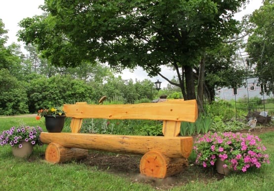 Если в вашем хозяйстве найдется два толстых обрезка бревна и парочка досок толщиной 6-7 см, то соорудите из них лавочку со спинкой. Завершая конструкцию, попробуйте свои силы в искусстве резьбы. Наверняка у вас получится интересная инсталляция подобная той, которая запечатлена на фото ниже.