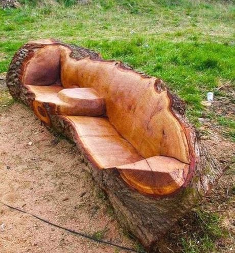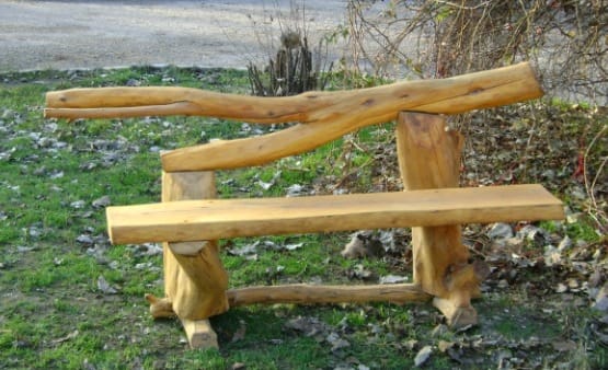 Если после обрезки сада у вас остались толстые ветки, не спешите распиливать их на дрова. Среди них наверняка найдется оригинальный элемент для садовой скамейки, как на следующем фото.