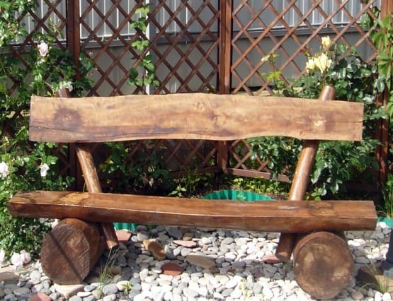 Если бревен и пеньков не нашлось, то можно обойтись и обычными строганными досками. Конструкция будет выглядеть изящнее, если у спинки и сиденья будут аккуратно закруглены края. Ножки можно сделать не прямыми, а слегка изогнутыми, вырезав их из широкой и достаточно толстой доски (50-60 мм).