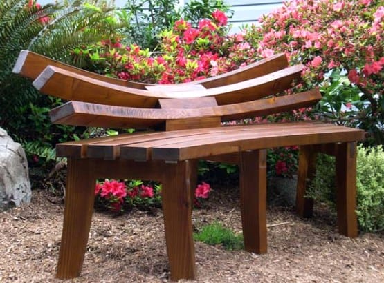 Овладев технологией гибки древесины, попробуйте соорудить из нее лавочку со спинкой необычной формы, как на фото. Сиденье у этой конструкции сделано из гнутого бруска. Столь оригинальное сооружение украсит приусадебный участок и сможет претендовать на призовое место в конкурсе дизайна.