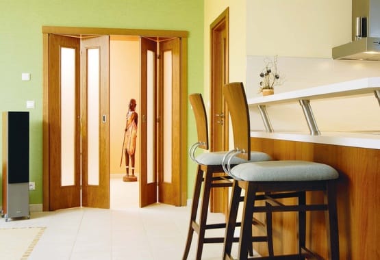 5. Двери гармошки (книжки). Задумывались как альтернатива раздвижным и распашным дверям для широких проемов. Имеют довольно интересный дизайн, который можно обыграть при создании авторского интерьера, но довольно ненадежны и неудобны в эксплуатации.