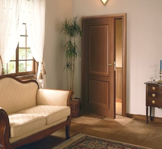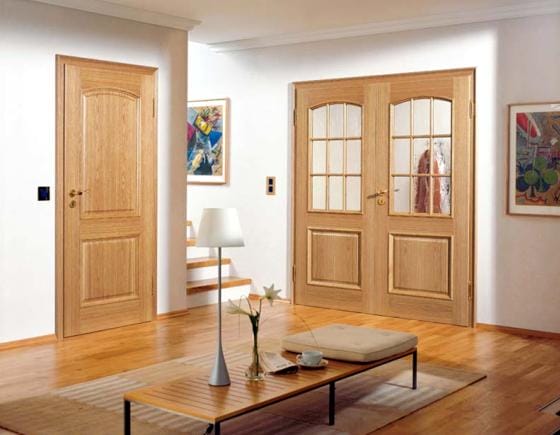 Межкомнатные двери из массива дерева – в основном изготавливаются клееного бруса хвойных видов (сосна, лиственница), элитные изделия из массива твердых (дуб, бук, клен, орех) или мягких (ольха, тополь, ель) пород.
