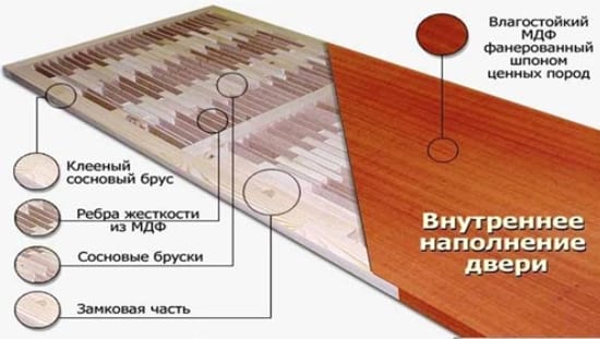 - Прочность самого дверного полотна и декоративного покрытия несколько ниже, чем у массива;