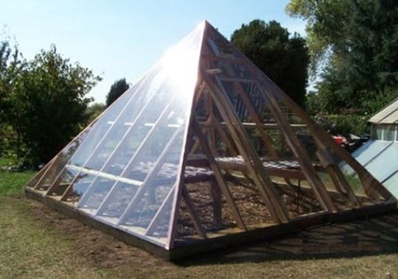 Поклонникам оригинальных решений наверняка понравится мини-теплица в виде пирамиды. Она также изготавливается из деревянных брусков и может быть накрыта обычной полиэтиленовой пленкой. На фото №3 представлен вариант такой конструкции.