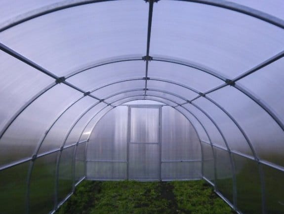 Сотовый поликарбонат, появившись на рынке, сразу же стал хитом тепличного строительства. Он одинаково хорошо комбинируется как с деревянным, так и со стальным каркасом. Благодаря высокой гибкости листа, его можно укладывать на арочный каркас, снижая до минимума снеговую нагрузку (фото №5).