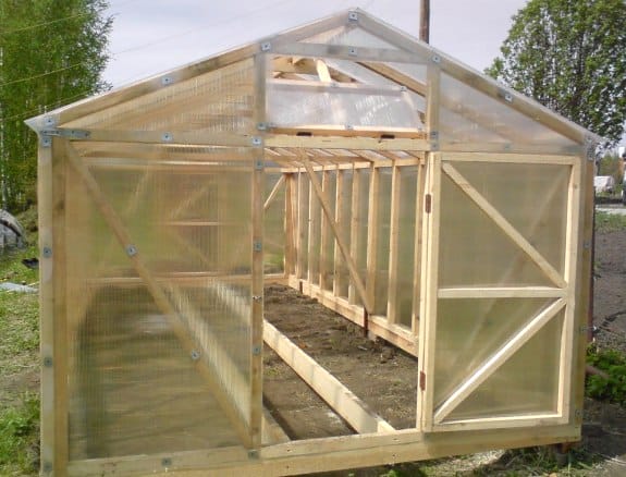 В качестве светопрозрачного материала можно использовать толстую полиэтиленовую пленку или более долговечный и прочный поликарбонат. Каркас такой теплицы крепится к деревянной раме через стальные резьбовые шпильки, забетонированные в столбики из асбоцементной трубы.