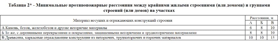 Как мы видим, данная таблица четко определяет зависимость материала, из которого возведены приусадебные постройки (дом, гараж, сарай и т.д.) и противопожарными разрывами между ними.