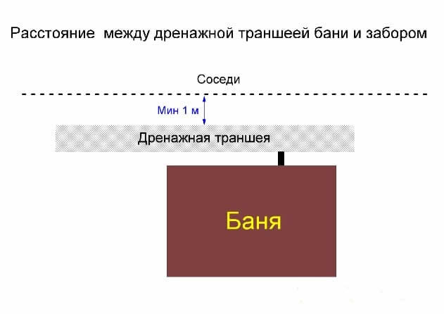 Планируя размещение бани на своей усадьбе также следует учесть схему отвода канализационных стоков. В соответствии с СП 53.13330.2011, минимальный отступ от дренирующей траншеи (засыпанной фильтрующей смесью из гравия и песка) до забора соседнего участка должен составлять 1 метр.