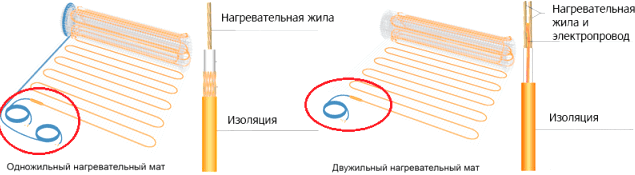 Двухжильный мат состоит из двух проводников: греющего и обычного, токопроводящего.
