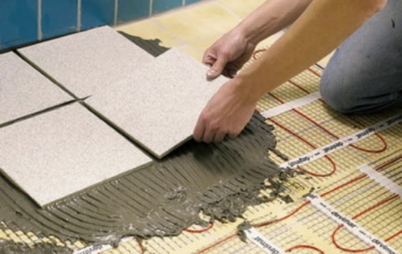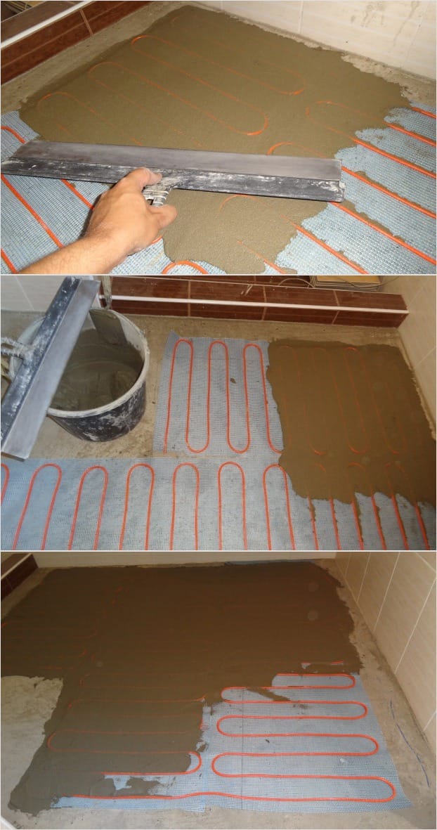 6) После всех описанных процедур можно приступать к укладке плитки. Производители теплых полов рекомендуют залить весь нагревательный мат тонким слоем плиточного клея, для того чтобы защитить его от случайных механических воздействий. Для этой работы используют термостойкий плиточный клей на основе эпоксидной смолы Он выдерживает температуру от +50 С и более. Слой клея не должен быть толстым. Он должен лишь покрывать промежутки между кабелем, не выступая наружу.