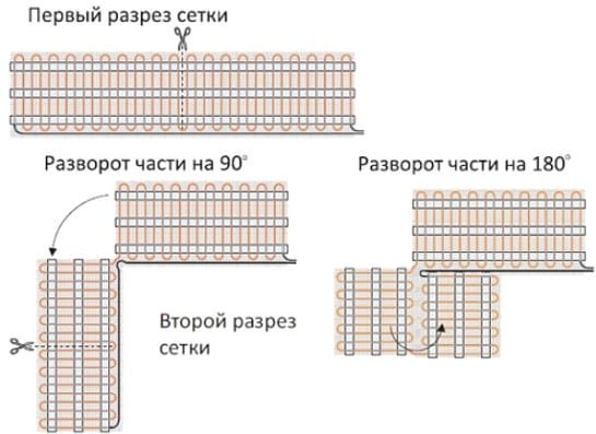 Для изменения конфигурации раскладки мата разрешается резать армирующую сетку, разворачивая получившиеся секции в нужном направлении. Целостность греющего кабеля при этом не должна нарушаться.