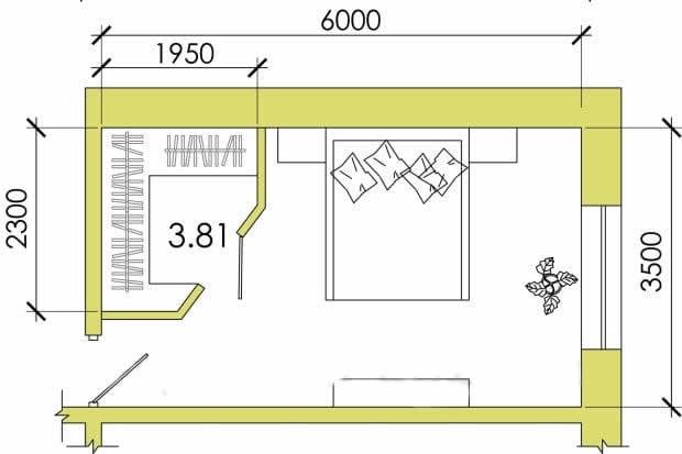 На схеме гардеробная располагается слева от входа. Данная спальня площадью 21 кв. м. позволяет устроить достаточно вместительную гардеробную площадью 3.81 кв. м.