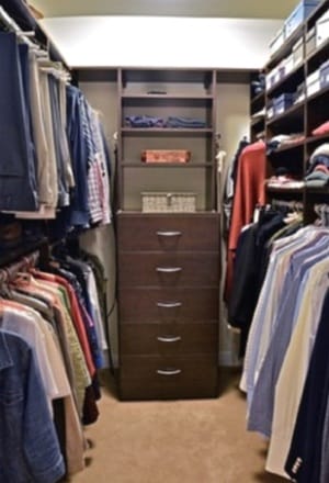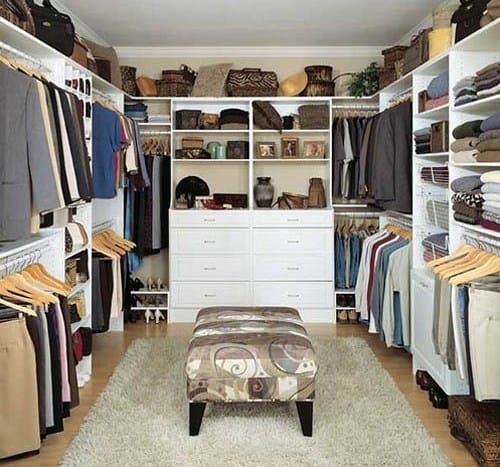 П-образная комната-гардероб, выделенная из помещения спальни дополнительной перегородкой – наиболее удобный вариант планировки. В ней достаточно места для вещей, в такое помещение вхожи обитатели дома, здесь можно расположить зеркала, ширмы и многое другое.
