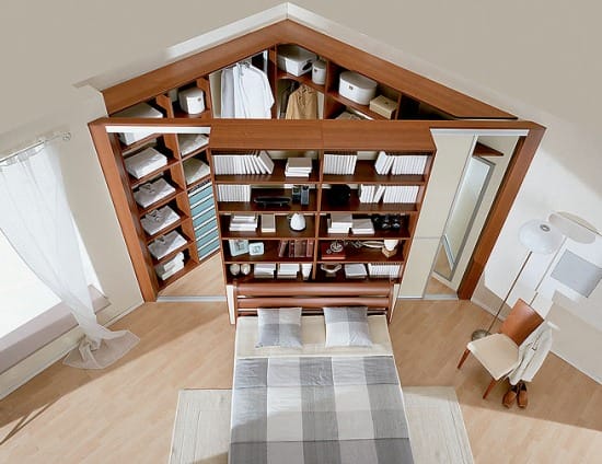 В небольшой спальне площадью всего 13.68 кв. м. тоже можно устроить угловую гардеробную площадью чуть больше 2 кв. м., расположив при этом мебель параллельно и перпендикулярно скошенной стене.