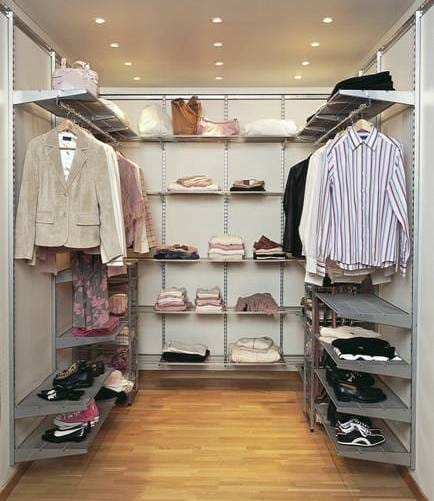Можно сделать гардеробную комнату из кладовки, правда, размеры кладовки в квартирах обычно не очень велики. Но это не должно стать препятствием для воплощения мечты. Полки и рейлинги расположите по двум сторонам помещения, максимально используя полезное пространство. Небольшая гардеробная все же лучше, чем ее полное отсутствие.
