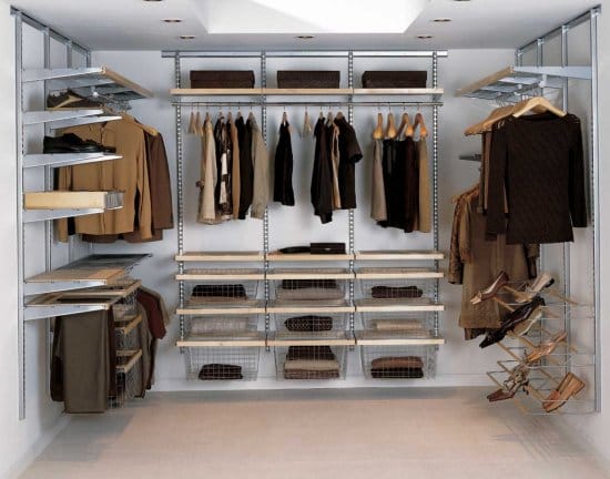 Дизайн гардеробной комнаты зависит от размера помещения и выбранной системы хранения. Металло-каркасные конструкции стоят дороже, но позволяют варьировать высоту полок, выдвижных корзин и рейлингов, меняя их при необходимости, однако такие системы смотрятся очень технично.