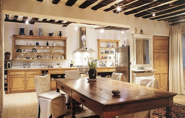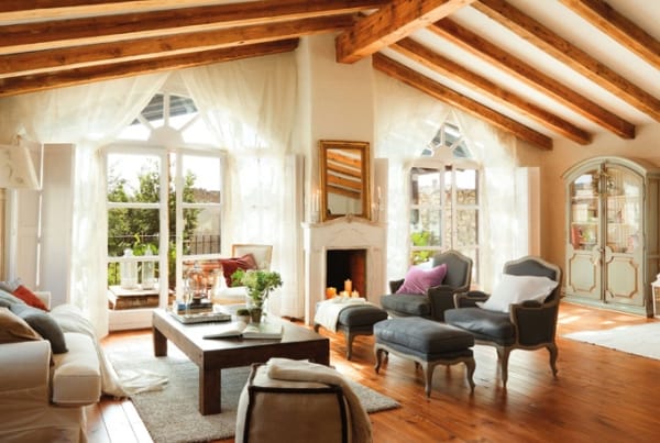 Сложная форма крыши, не редко с открытыми балками, создаст особую атмосферу загородного дома.