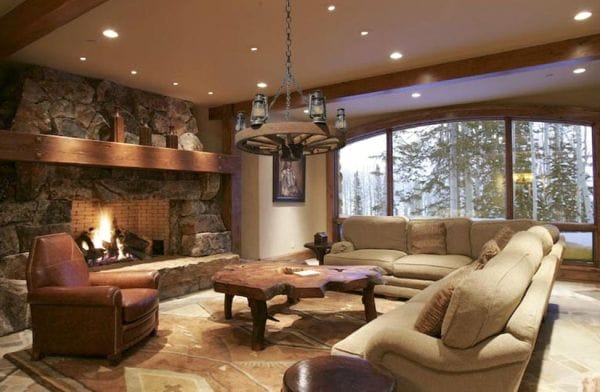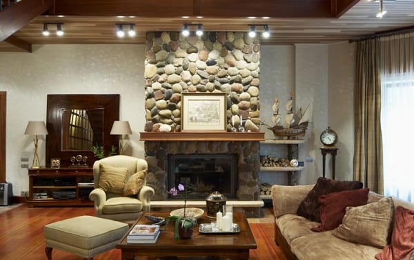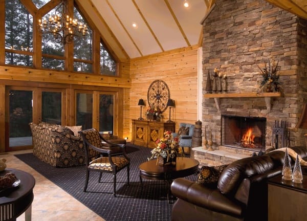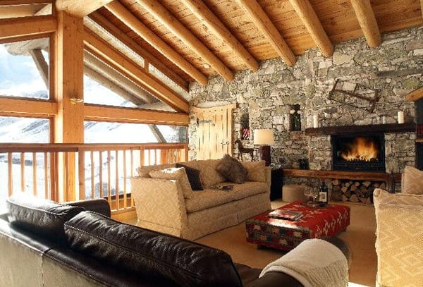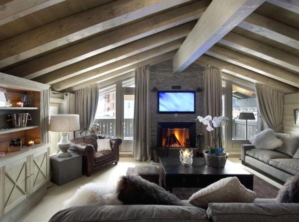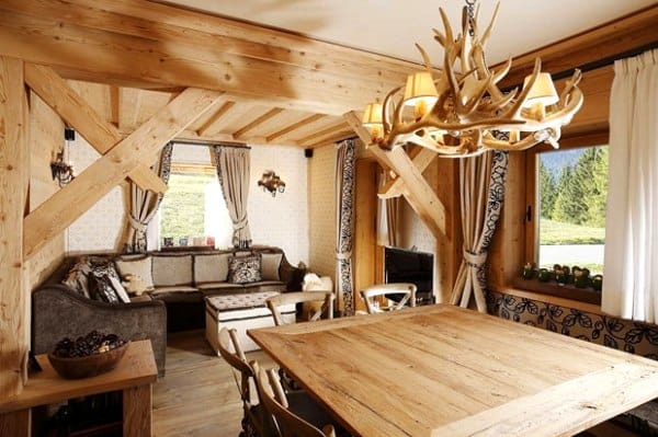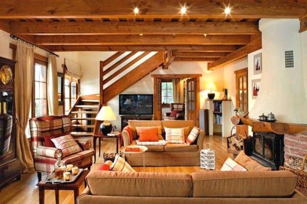 В домах в стиле «шале» отделка помещений предполагает использование натурального дерева, камня, штукатурки, потолочных деревянных балок, массивных светильников.