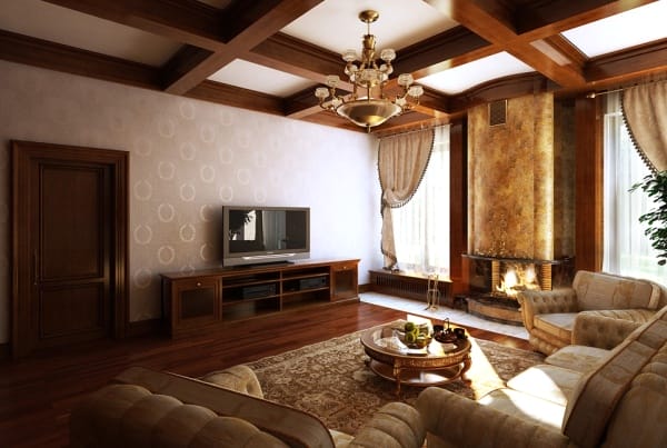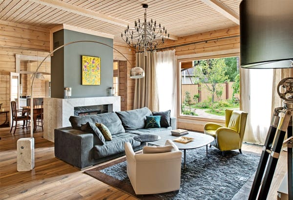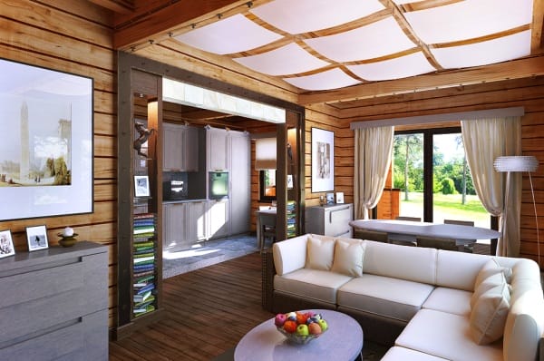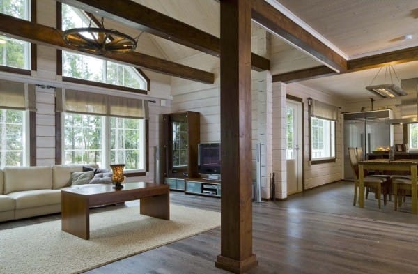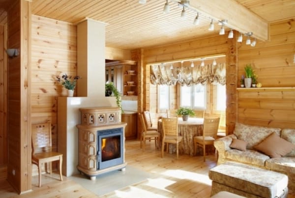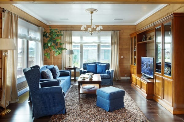 Интерьер гостиной деревянного дома, часто решается в стиле близком к стилю «русская изба» с отделкой из натурального дерева.