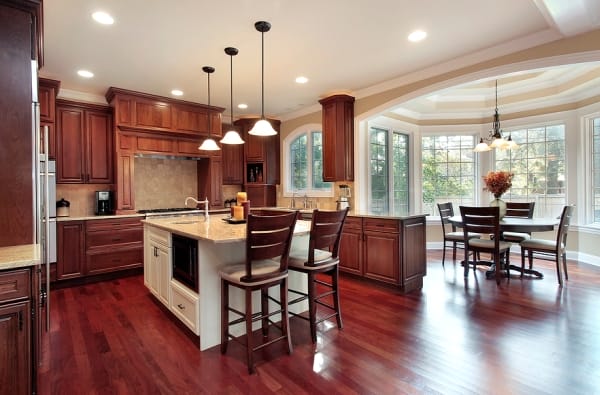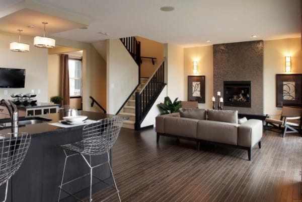 Визуально разделить пространство на функциональные зоны можно при помощи разнообразной отделки стен и пола (кафель, штукатурка, обои и т.д.), применяя различные цвета либо их оттенки, а так же при помощи освещения. Дизайн кухни-гостиной в частном доме зависит от предпочтений хозяев и выбранного стиля.