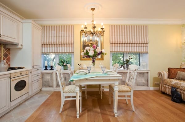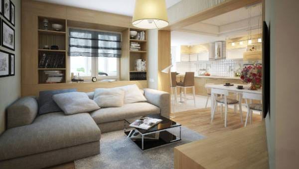 Функционально гостиную и кухню можно разделить столовой зоной, установив между ними большой обеденный стол.