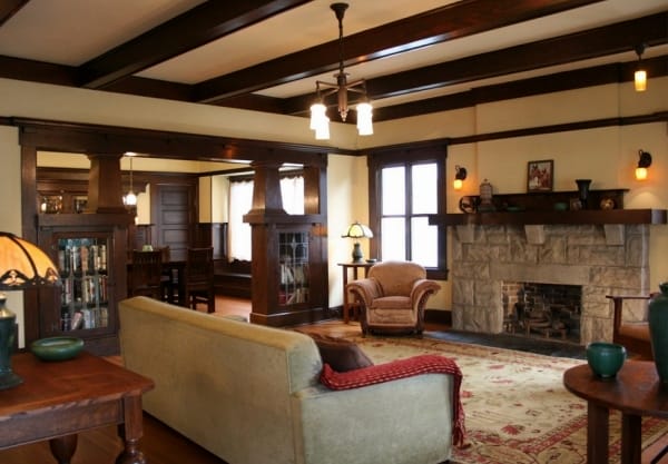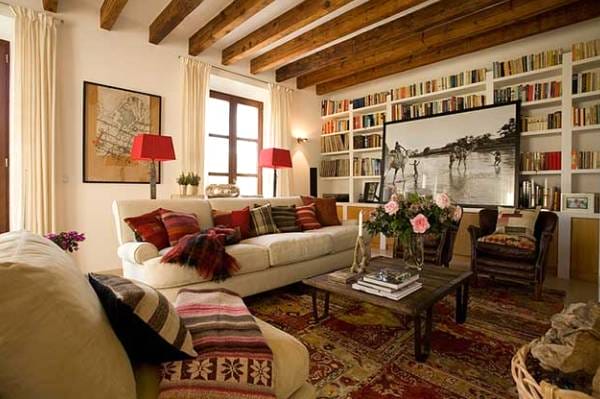 Часто гостиная совмещается с библиотекой или каминной зоной.