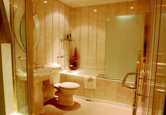 Пластиковые панели – дешевый и простой в монтаже вид отделки. Этим обусловлена их популярность, особенно при отделке ванной на даче. Различные типоразмеры и цветовая гамма дают возможность сделать помещение санузла практичным, но все же достаточно скромным по сравнению с другими видами отделки. Недостатком является то, что их достаточно легко повредить.