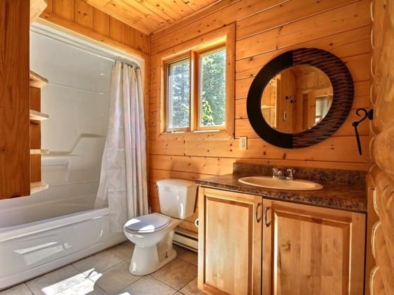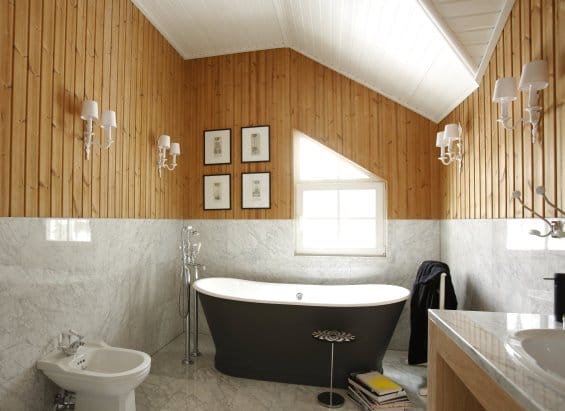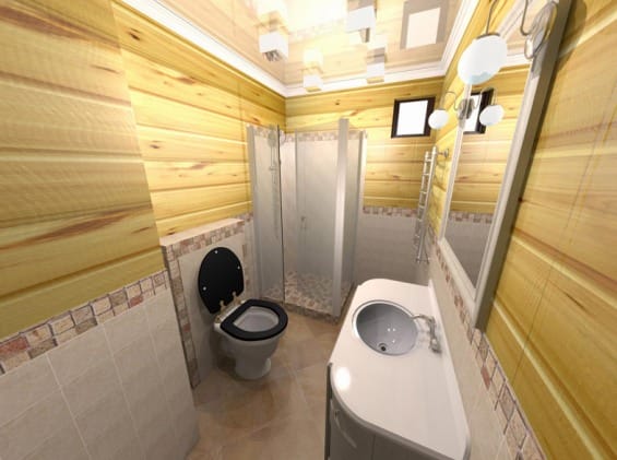 Отделка стен натуральным деревом: панелями, вагонкой, доской придаст санузлу особый колорит загородного дома, к тому же, если ванная комната находится в деревянном доме.