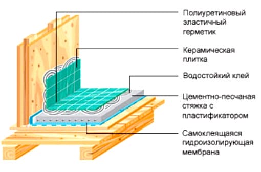 Но прежде чем приступить к отделке помещения облицовочным материалом, необходимо выполнить гидроизоляцию стен и пола. Если ванная расположена на втором этаже деревянного дома, то гидроизоляция просто необходима для защиты деревянных конструкций от влаги.