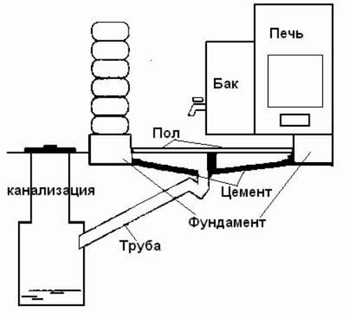 В подпольном пространстве моечного отделения нужно предусмотреть устройство простой системы канализации, обеспечив воде возможность свободного стока в септик.