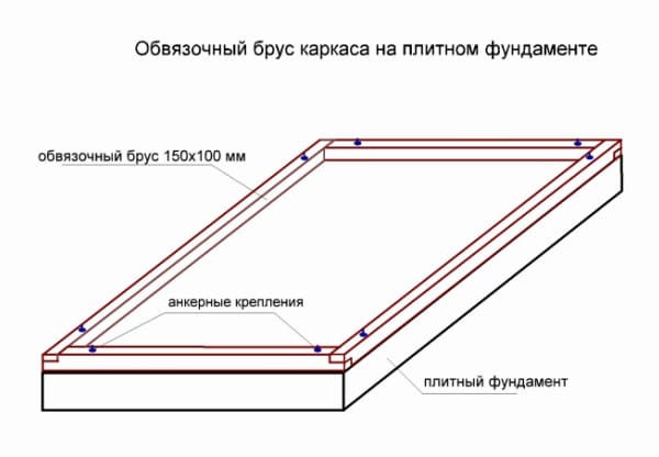 Вот так схематически выглядит фундамент с брусом, подготовленным под установку стоек каркаса.