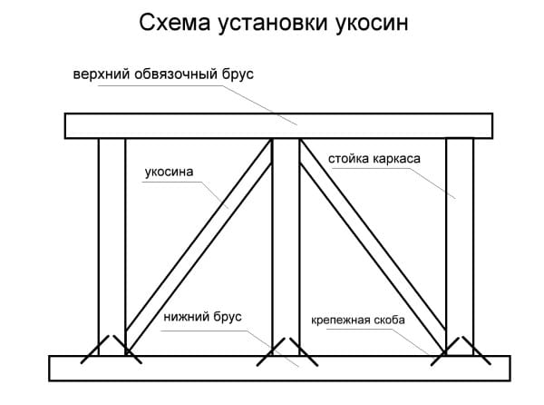Шаг каркасных стоек выбирают в интервале от 60 до 80 см. К опорному брусу их крепят стальными скобами. Не забывайте об установке укосин (подкосов) – прочных брусков или досок сечением 50х150 мм. Они значительно повышают объемную жесткость всей конструкции.