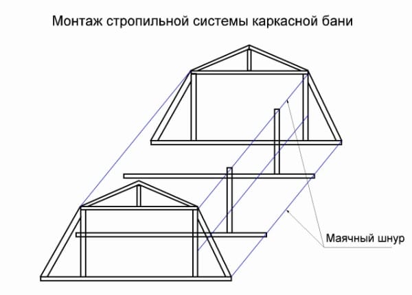 Установку стропильной системы мансардной крыши начинают с монтажа двух крайних ферм. Завязав их коньковым брусом, между ними натягивают шнур и выставляют по нему остальные элементы конструкции.