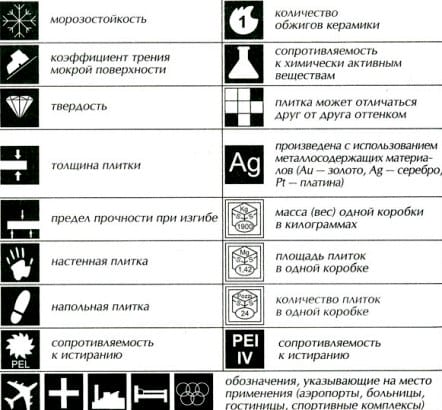Если на черном фоне нарисована ступня, то это напольная плитка, а заштрихованный фон скажет о ее повышенной износостойкости. Изображенные кисти рук – настенная, снежинка – морозоустойчивая.
