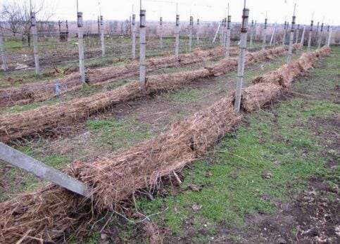 Следующим этапом будет укрытие винограда на зиму. В этом случае очень важно сделать это вовремя. Ведь если поспешить, то почки могут выпреть, а если опоздаешь – растение погибнет от морозов.