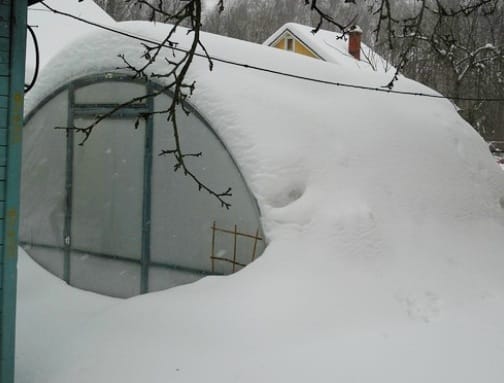 Не стоит также тешить себя мыслью о том, что сделав теплицу круглой, мы тем самым на 100% обезопасим ее от «снежной шапки». Практика показала, что в момент резкого похолодания после оттепели, на поверхности круглой теплицы образуется наледь, на которой прекрасно удерживается тяжелый слой льда и снега.