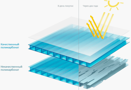 Добросовестные европейские и российские производители уделяют большое внимание защите своего продукта от ультрафиолета. Китайский поликарбонат часто идет или вообще без защиты или получает ее лишь символически. На него не наносят пленку, а лишь вводят в сырьевую массу дешевые «присадки» от солнечного излучения. В результате такой пластик стоит на теплице не более 2-3 лет, после чего мутнеет и начинает разрушаться.