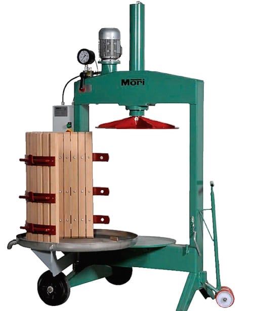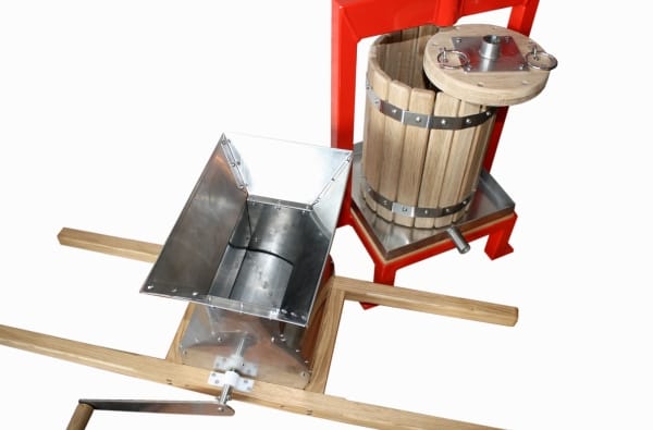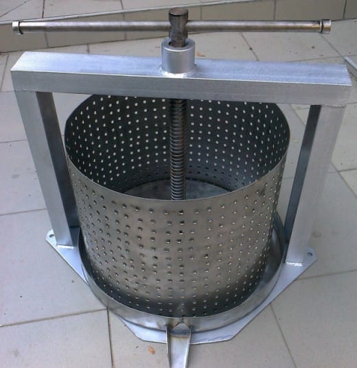 В нем нет перфорированной емкости для отделения сока. Вместо нее используется несколько деревянных дренажных рамок. Между ними укладывают мешочки с измельченным сырьем. Ручной гидродомкрат развивает большое усилие (от 1 до 5 тонн). Благодаря этому объем получаемого сока достигает 70% от объема заложенных фруктов.