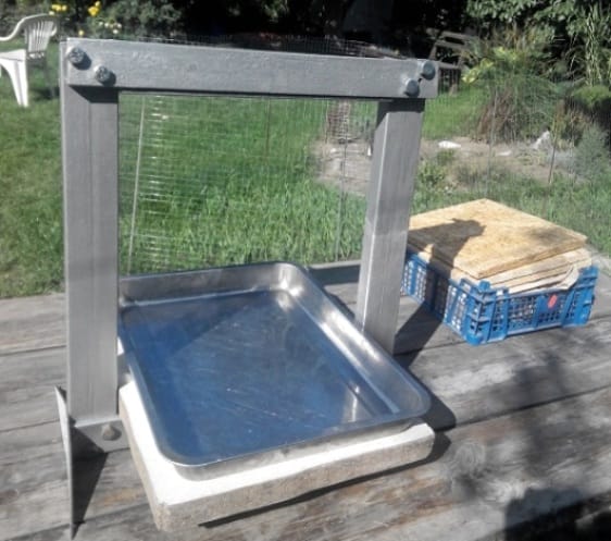 А вот более сложная конструкция гидравлического пресса, сделанного своими руками. Здесь мастер решил использовать винт в качестве фиксатора фруктовой закладки, помещаемой в перфорированный кожух из нержавейки. Гидравлический домкрат он поместил под рамой. Опорная площадка сделана не стационарной, а скользящей. Домкрат перемещает ее вверх по профилю рамы.