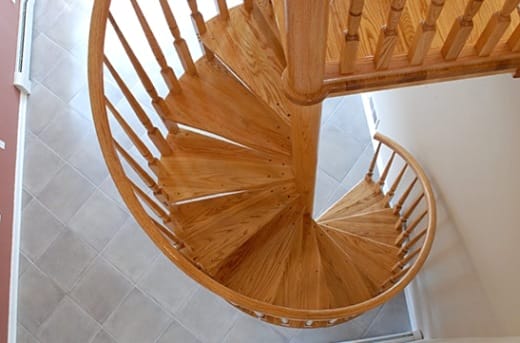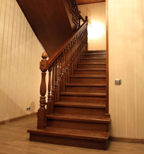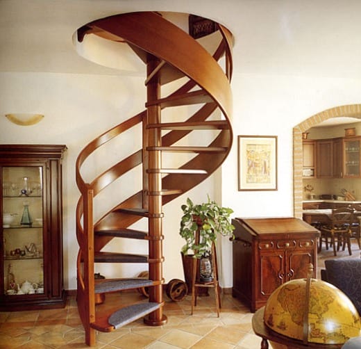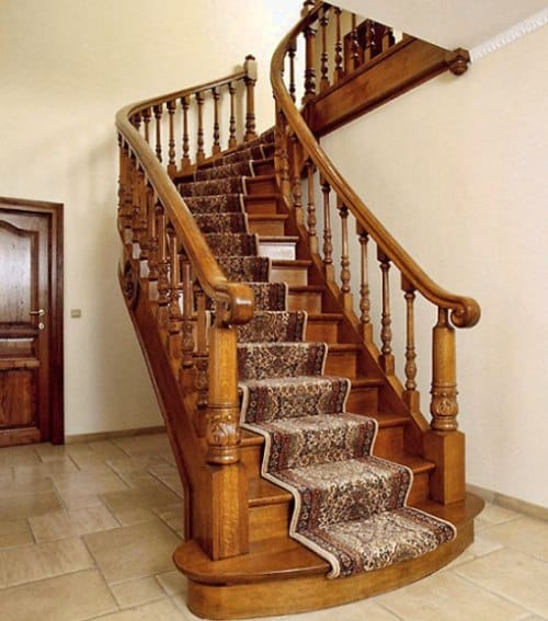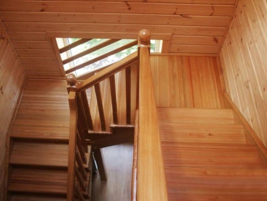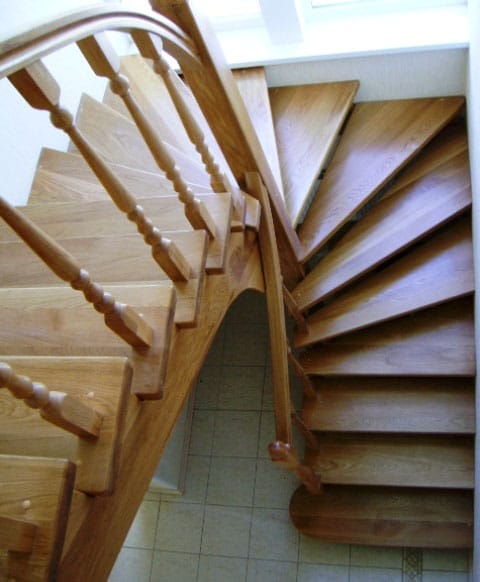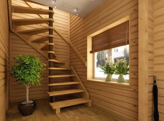 В небольшом помещении часто устанавливают винтовую лестницу или конструкцию с забежными ступенями. Винтовые лестницы из дерева красивы, изящны, занимают не много места, но менее удобны при частом использовании.