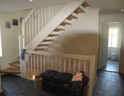 При большой площади прихожей или гостиной, где устанавливается лестница, высоту ступеней лучше делать минимальной, а ширину достаточно удобной. Особое внимание нужно уделить наличию межлестничной площадки и перил. Данные элементы просто необходимы для безопасности, когда в доме проживают маленькие дети и пожилые люди.